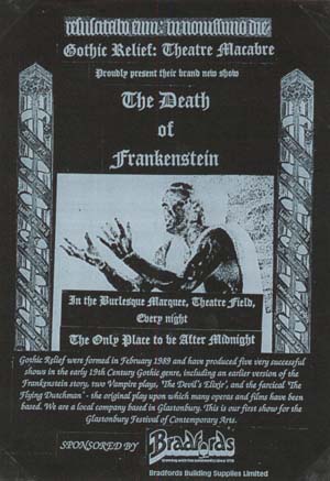 - In June 1990, I played Dr. Frankenstein in "The Death of Frankenstein" written by myself and Ean D'Albion, in the Theatre Field at the Glastonbury Festival, each night, at midnight, on a huge stage, with a firework finale.