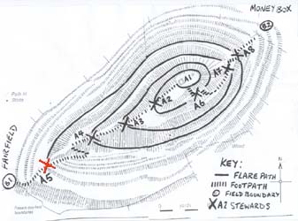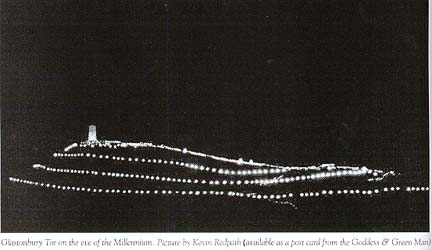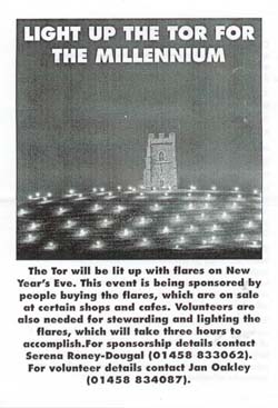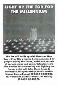 | On Millennium night, I 'held the West', marshalling the hundreds of people who saw in the new year on Glastonbury Tor on and off the rather muddy hill. My friend Howie 'held the East'. The event was set up by Serena Roney-Dougal and Jan Oakley, and lit up the hill with hundreds of flares. The most enjoyable part of my role was to entertain the crowds up and down the Tor as they queued to get through the narrow muddy stile at the Western foot of the Tor, once the Millennium had been seen in. Many of the locals (both Somerset and 'alternative') recognised me, enjoying the cheeky, friendly character who kept peoples' spirits up as they waited to get back to the pub... |