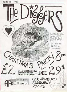 | During that Summer I began to write love songs, too. In Autumn 1990 I formed a band with Charlie Miller and Tim Hall called "The Diggers", playing Tim's classic old Electric Piano. Oshia Drury and Claire Jones joined us on doo-wop and we began to play gigs in November 1990, and continued playing together for over a year. In January 1991, I took on the Musical Direction of Glastonbury Town Players' pantomime "Alice" providing songs and incidental music composed and performed by myself with a small pit-band. | |||