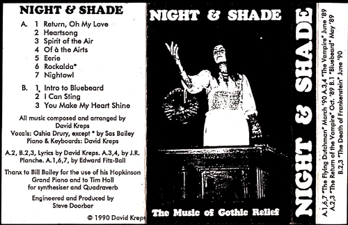 ![]() | I studied piano from aged 8 to 15, with a year of violin, and a year of church organ. I was lead soprano in the school choir until my voice broke, and sang the Pie Jesu in a school performance of Faure's "Requiem". I took up the piano again in February 1989, after a ten year gap, teaching myself to play again by daily practice, on an old joanna belonging to Issi von Trap kept in the Assembly Rooms, Glastonbury. With the Abbey Players, in May 1989, I accompanied the action live, upon the piano, throughout, save for a cameo role as an Alchemist, in Rollo Maughling's "Bluebeard", which was produced by Gothic Relief, and performed at the Assembly Rooms. By June, with the second Gothic Relief show, I was writing songs to lyrics in the 1820s scripts which we were performing, and had taken on the musical direction of the company. | ||